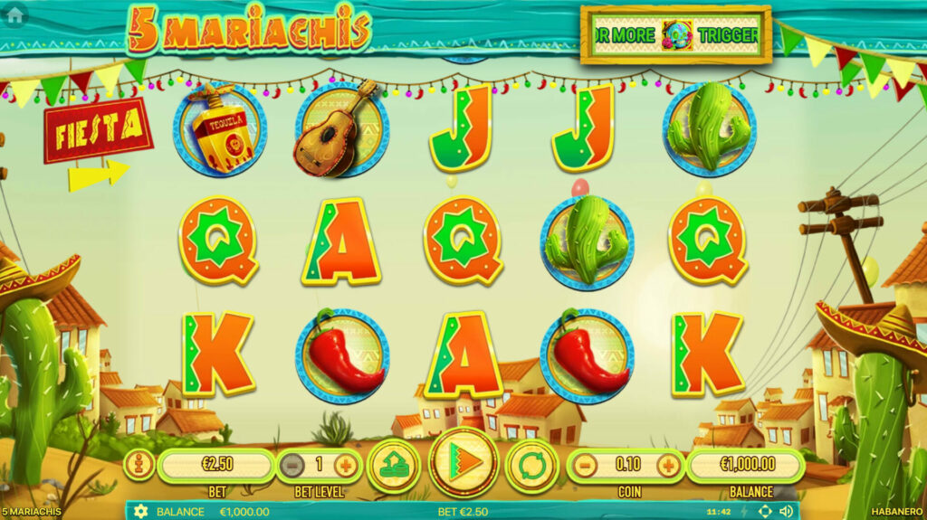 No. 5 Mariachis does not offer a Bonus Buy and has no progressive jackpot. Its win potential comes from Free Spins, wild interactions, and the Piñata Bonus. Top exposure is moderate by design; always check the paytable in your session for the displayed maximum win and any operator-set caps.