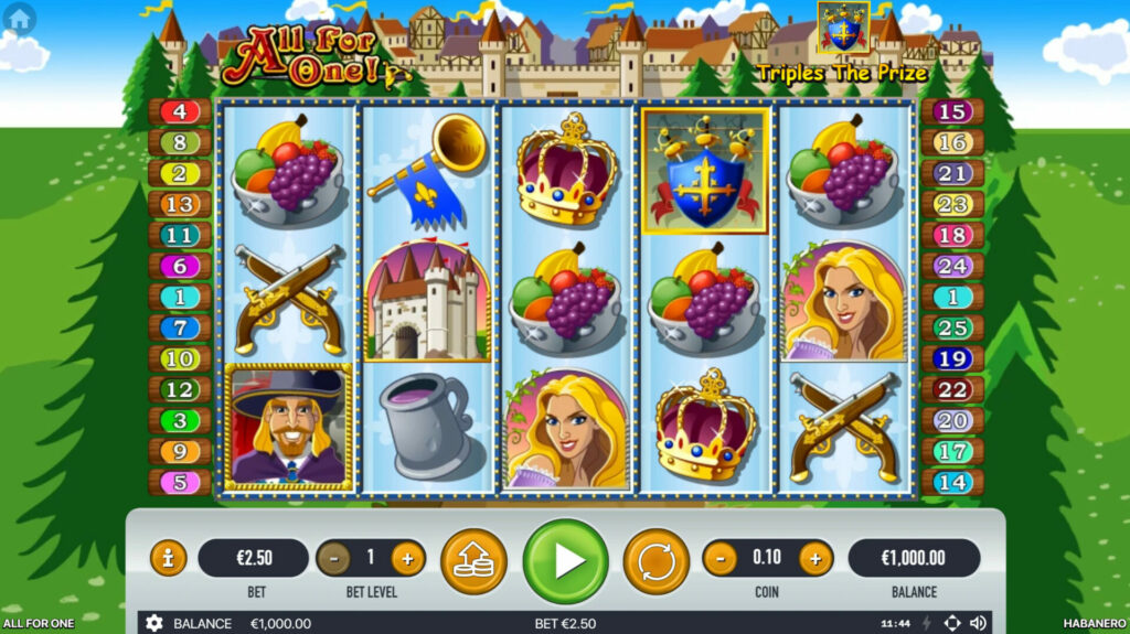 All For One Online Slots is a musketeer-themed, 5‑reel slot with fixed paylines in most versions. Expect medium–high volatility, with wilds, scatters, and multipliers feeding into free spins or a bonus game. Exact RTP, line count, and max win vary by build—check the in‑game info panel.